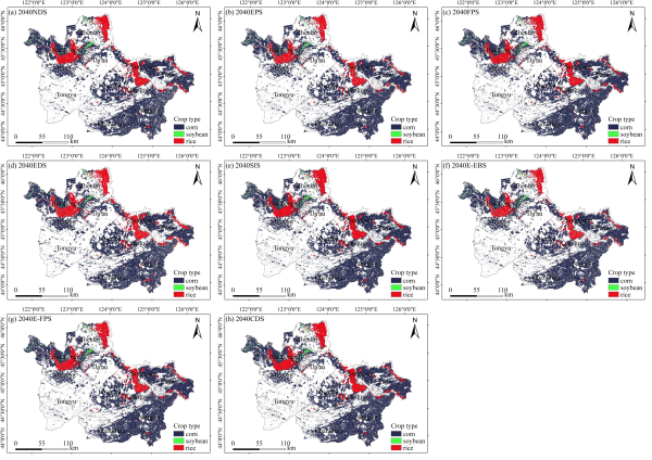 圖7 未來不同發展情景下吉林省西部主要作物的種植分布