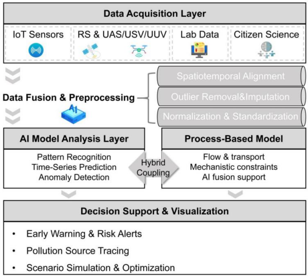 在全球城市化加速與氣候變化疊加影響下,水污染問題日趨嚴(yán)峻,傳統(tǒng)水質(zhì)監(jiān)測手段因響應(yīng)滯后、覆蓋范圍有限和應(yīng)對突發(fā)事件能力不足,已難以滿足當(dāng)前水環(huán)境治理需求。人工智能(AI)技術(shù)的快速發(fā)展為解決這一問題提供了新路徑。中國科學(xué)院東北地理與農(nóng)業(yè)生態(tài)研究所水環(huán)境健康與模擬學(xué)科組在綜述性研究中提出,通過整合AI與物聯(lián)網(wǎng)(IoT)、遙感(RS)及無人監(jiān)測平臺(UMP)等技術(shù),構(gòu)建混合建模框架,有助于提升實(shí)時(shí)水質(zhì)監(jiān)測精度與效率,拓展數(shù)據(jù)獲取范圍,并實(shí)現(xiàn)多源異構(gòu)數(shù)據(jù)的融合與智能分析。