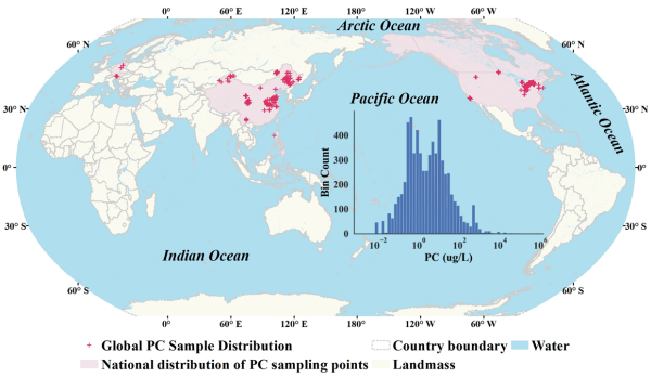 圖1 全球藻藍蛋白(PC)樣點(圖中紅色+)和頻率分布(直方圖)