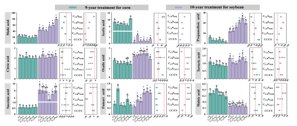 東北地理所農(nóng)田分子生態(tài)學(xué)科組科研人員基于長(zhǎng)期田間定位試驗(yàn),系統(tǒng)解析了玉米-大豆輪作與連作模式下,不同施肥及有機(jī)物料管理措施對(duì)作物生育期間土壤低分子量有機(jī)酸種類、數(shù)量及其與土壤酸化指標(biāo)間的關(guān)系;在連作、輪作、施肥措施和作物秸稈還田條件下通過(guò)作物移除的陰離子和陽(yáng)離子來(lái)計(jì)算凈H?、總H?和OH?的生成,并探討長(zhǎng)期管理對(duì)作物離子移除差異的響應(yīng),從而揭示凈H?生成與土壤酸化之間的關(guān)系。研究結(jié)果表明,種植玉米土壤中,低分子量有機(jī)酸(LMWOAs)主要為蘋(píng)果酸、乙酸和丙二酸,而種植大豆土壤中,低分子量有機(jī)酸主要為蘋(píng)果酸、丙二酸和琥珀酸。連作顯著改變了玉米拔節(jié)期和大豆開(kāi)花期土壤LMWOAs含量(圖1)。此外,作物生長(zhǎng)旺盛期土壤LMWOAs和鹽基離子總量對(duì)黑土農(nóng)田土壤酸化過(guò)程的影響與作物種類及田間管理措施密切相關(guān)。玉米和大豆移除產(chǎn)生的凈H?可能分別導(dǎo)致土壤pH每年下降0.053-0.074和0.032-0.045個(gè)單位。研究認(rèn)為,土壤pH的變化并不完全與作物鹽基離子移除相關(guān),糞肥施用與輪作結(jié)合是緩解土壤酸化的有效方法,糞肥緩解土壤酸化的效果優(yōu)于秸稈還田。大氣酸沉降、施肥與管理方式、作物種植類型以及作物秸稈離田的鹽基離子移除作用是黑土酸化主要原因(圖2)。上述研究揭示了黑土酸化的本質(zhì)與關(guān)鍵過(guò)程,為東北旱田黑土土壤酸化機(jī)理提供了重要的理論支撐,也為研發(fā)有效的防治酸化措施奠定了科學(xué)基礎(chǔ),對(duì)保障糧食穩(wěn)產(chǎn)高產(chǎn)、維護(hù)國(guó)家糧食安全具有重要戰(zhàn)略意義。