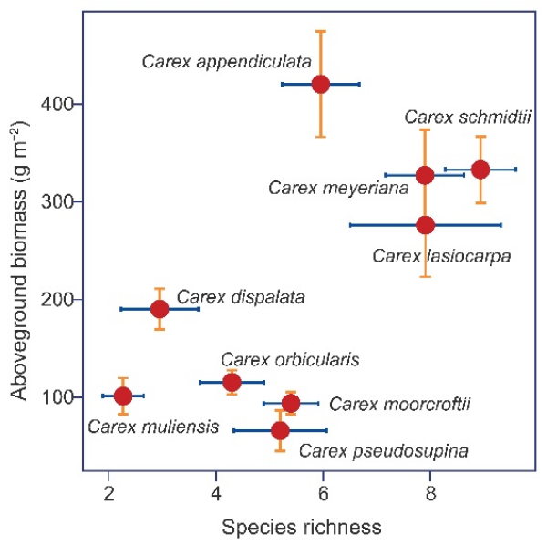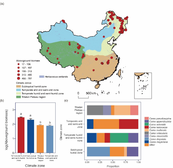 地上生物量是評估生態(tài)系統(tǒng)結(jié)構(gòu)與功能的關(guān)鍵指標(biāo)。莎草類濕地(sedge wetlands)廣泛分布于全球溫帶沼澤和山地區(qū)域,具有固碳、維持生物多樣性和調(diào)節(jié)氣候等重要生態(tài)功能。然而,目前關(guān)于全國尺度莎草類濕地地上生物量分布格局及其影響機制尚不清楚。明確莎草類濕地地上生物量的空間分布及其生物和非生物影響機制,對預(yù)測濕地功能對未來環(huán)境變化的響應(yīng)至關(guān)重要。