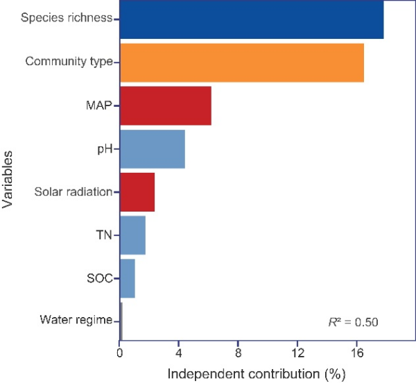 東北地理所科研人員結(jié)合國家濕地資源調(diào)查數(shù)據(jù)與遙感獲取的氣候信息數(shù)據(jù),以我國125個典型莎草類濕地樣點為研究對象,明確了我國國家尺度濕地地上生物量的空間格局,分析了莎草類濕地植物物種豐富度與地上生物量的關(guān)系,揭示了生物和非生物因素對地上生物量的貢獻及影響機制。研究結(jié)果表明,中國不同氣候區(qū)莎草類濕地地上生物量具有顯著差異。非生物因子和生物因子共同影響莎草類濕地地上生物量。其中,生物因子在決定地上生物量分布格局中占主導(dǎo)地位。植物物種豐富度對地上生物量具有促進作用,而地上生物量與物種豐富度的關(guān)系受群落類型調(diào)控。此外,年平均降水量是影響莎草類濕地地上生物量空間分布的最主要非生物因子,二者呈正相關(guān)關(guān)系。土壤性質(zhì)不僅直接影響地上生物量,還通過物種豐富度和群落類型間接影響地上生物量。