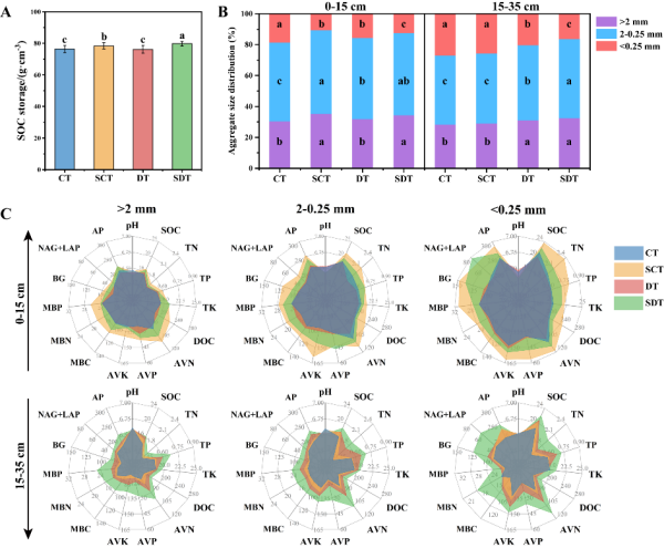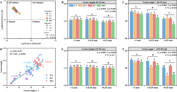 近期,中國(guó)科學(xué)院東北地理與農(nóng)業(yè)生態(tài)研究所黑土保護(hù)與利用學(xué)科組,依托秸稈還田定位試驗(yàn),分析了不同粒徑團(tuán)聚體(>2 mm、2–0.25 mm、<0.25 mm)的有機(jī)碳和養(yǎng)分含量、微生物群落結(jié)構(gòu)及其資源限制特征,揭示了秸稈還田通過(guò)團(tuán)聚體中微生物資源限制影響有機(jī)碳儲(chǔ)存的機(jī)制。研究結(jié)果顯示,秸稈深翻還田(SDT)在0-35 cm土層中的土壤有機(jī)碳儲(chǔ)量顯著高于其他處理,較常規(guī)耕作(CT)、秸稈淺翻還田(SCT)和深翻(DT)分別提高了4.45%、1.71%和4.64%(圖1)。秸稈還田(SDT和SCT)顯著增加了>2 mm團(tuán)聚體比例,提高了其養(yǎng)分含量和微生物生物量。酶化學(xué)計(jì)量分析進(jìn)一步表明,秸稈還田能有效緩解了微生物的碳和磷限制,該效應(yīng)在深翻條件下尤為顯著(圖2)。