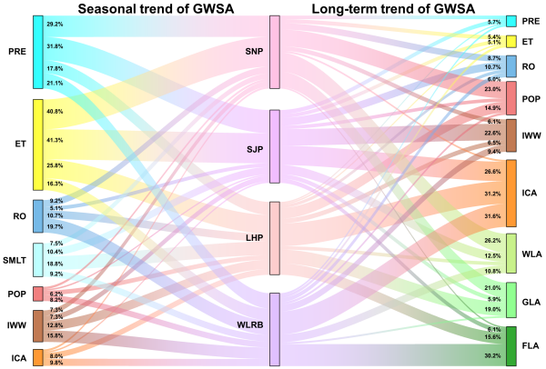 東北地理所水文與水資源學科組研究人員利用高空間分辨率GRACE重力衛星數據,反演獲取東北黑土區地下水儲量動態數據,在系統解析地下水儲量變化時空規律的基礎上,運用時間序列分解和隨機森林回歸模型,識別并量化自然因素與人類活動對重點區域地下水儲量變化季節趨勢、長期趨勢變化的驅動因素及貢獻程度。