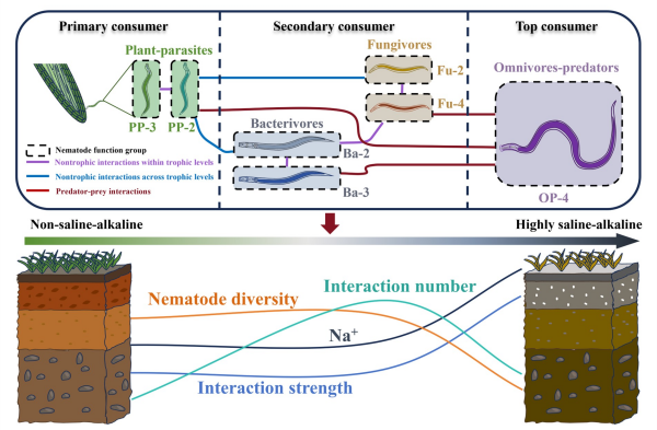 研究團(tuán)隊(duì)沿鹽堿梯度設(shè)置了非鹽堿化、弱鹽堿化、中度鹽堿化和高度鹽堿化四個(gè)等級(jí)的土壤樣點(diǎn)。通過(guò)將線蟲按取食行為和生活史策略劃分為不同功能群,并根據(jù)各功能群所處生態(tài)位進(jìn)一步將功能群間的相互作用劃分為三類:營(yíng)養(yǎng)級(jí)內(nèi)非營(yíng)養(yǎng)相互作用、跨營(yíng)養(yǎng)級(jí)非營(yíng)養(yǎng)相互作用以及捕食者-被捕食者相互作用,系統(tǒng)構(gòu)建了線蟲功能群網(wǎng)絡(luò)。