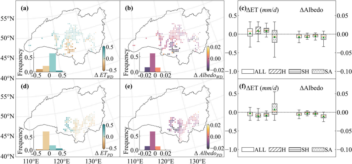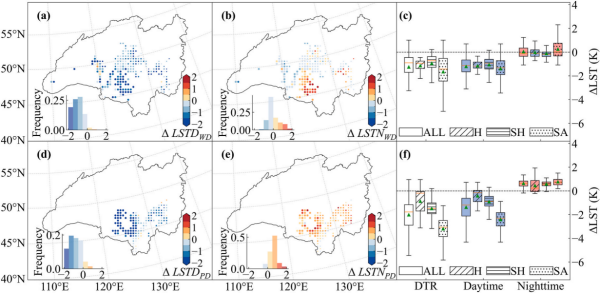 圖1. 濕地變化對白天地表溫度與夜間地表溫度(ΔLSTD 和 ΔLSTN)及其晝夜溫差(DTR)的影響。a–c:自然濕地在不同氣候區(qū)對白天、夜間溫度及晝夜溫差的影響;d–f:在相同氣候背景下人工濕地的對應影響。ALL、H、SH 和 SA 分別代表全區(qū)、濕潤、半濕潤和半干旱區(qū)。點的顏色表示增暖或降溫效應:紅色為增暖,藍色為降溫;點的大小也對應 H、SH 和 SA 區(qū)域,依次增大。