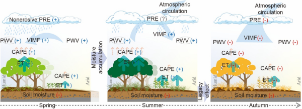 圖1 中國溫帶植被物候提前對降雨影響的物理機(jī)制示意圖