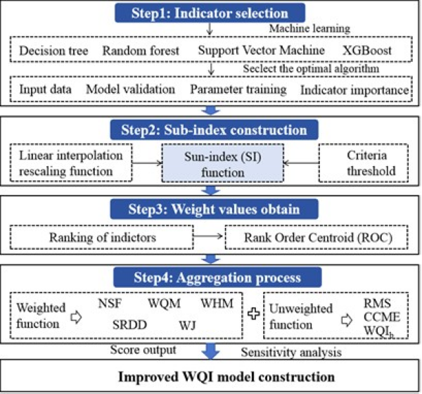 針對以上不足和問題,中國科學(xué)院東北地理與農(nóng)業(yè)生態(tài)研究所科研人員基于121個采樣點構(gòu)建了MCS-RP-TOPSIS-GSA綜合評估模型,減少了采樣頻率不足與操作誤差導(dǎo)致的不確定性,重新分配指標權(quán)重,最終通過隸屬函數(shù)(最優(yōu)系數(shù)P=1.15)實現(xiàn)富營養(yǎng)化等級劃分,構(gòu)建了區(qū)域水體富營養(yǎng)化評價指標Qi,模型精度顯著高于傳統(tǒng)TLI模型(圖1)。評價了多水體類型的富營養(yǎng)化對比框架,系統(tǒng)分析多好尺度驅(qū)動因素的耦合作用。結(jié)果表明中西部區(qū)域水質(zhì)低于東部地區(qū),深水湖庫的富營養(yǎng)化狀態(tài)優(yōu)于淺水湖泊優(yōu)于河流,TN、TP和CODMn是影響東北黑土區(qū)地表水富營養(yǎng)化的主要敏感因子。此外,基于480個全季節(jié)穆棱-興凱湖流域逐月水質(zhì)數(shù)據(jù),采用機器學(xué)習(xí)篩選關(guān)鍵指標,采用8種聚合函數(shù)優(yōu)化出最優(yōu)函數(shù),結(jié)合ROC方法分配指標權(quán)重,降低評估的不確定性,構(gòu)建改建的WQI模型來評估湖泊-流域的水質(zhì)狀態(tài)(圖2)。結(jié)合結(jié)構(gòu)方程模型(SEM),首次明確不同季節(jié)水質(zhì)惡化的主導(dǎo)驅(qū)動因素即夏-秋季以人類活動(灌溉面積、施肥量)為主,冬季-春季以自然因素(氣溫、降水、流量)為主,量化了自然與人類活動對水質(zhì)的耦合影響。