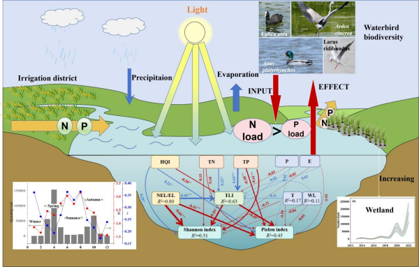 為了進(jìn)一步揭示濕地水鳥多樣性與水質(zhì)狀態(tài)之間的互饋機(jī)制,中國科學(xué)院東北地理與農(nóng)業(yè)生態(tài)研究所水文與水資源學(xué)科組研究人員基于2013-2022年的查干湖水鳥種類和數(shù)量野外調(diào)研數(shù)據(jù),結(jié)合逐月濕地水質(zhì)、氣象和土地利用數(shù)據(jù),利用結(jié)構(gòu)方程模型(SEM)和廣義加性模型(GAM)解析了查干湖水鳥多樣性變化及其驅(qū)動(dòng)因素的作用路徑與貢獻(xiàn)度;量化了水鳥通過生理代謝行為對(duì)濕地水體營養(yǎng)負(fù)荷的貢獻(xiàn)量;確定了影響水鳥多樣性的關(guān)鍵土地利用閾值(非生態(tài)用地/生態(tài)用地:NEL/EL)。