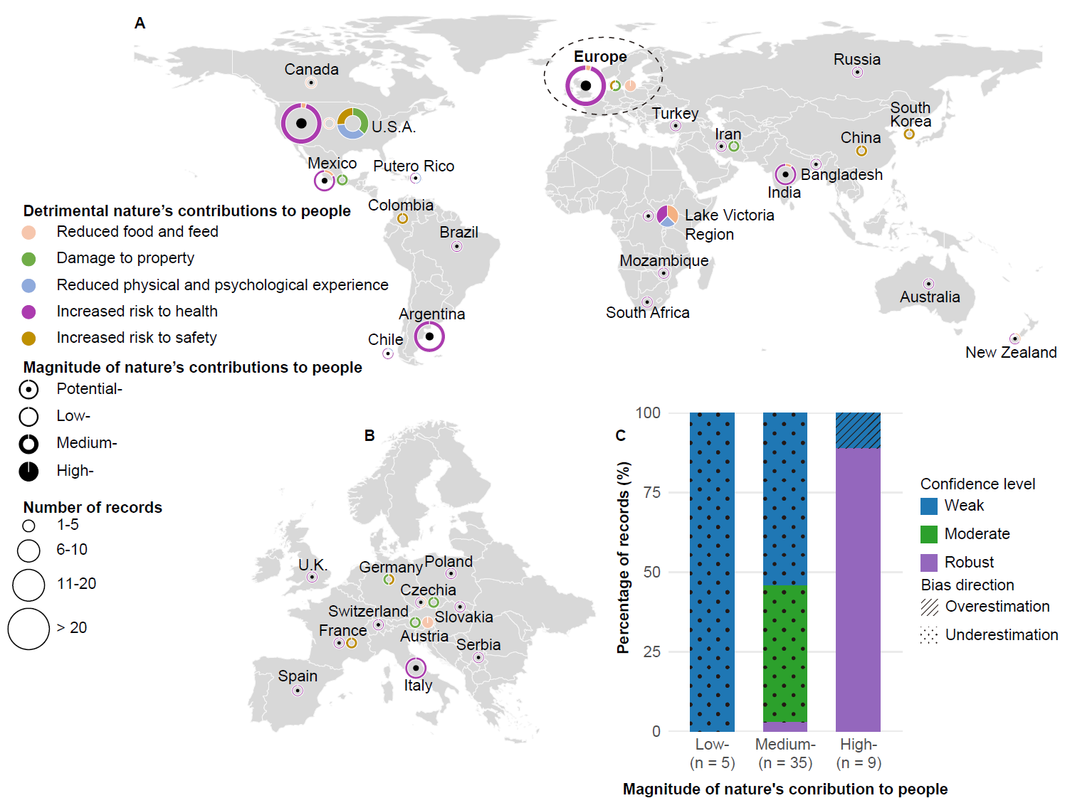 該研究基于“自然對人類貢獻(Nature’s Contributions to People)”框架開發了一套半定量評估方法,系統性評估了全球外來淡水大型動物對人類社會產生的正面與負面影響。研究結果表明,已有 93種外來淡水大型動物(占現存物種的43%)被引入到其本土分布區之外,涵蓋了魚類、哺乳類、爬行類和兩棲類。該研究共識別了429項正面社會經濟效應記錄(圖1),包括提升食物供給(57%)、促進休閑漁業和生態旅游(20%)以及提供生產和貿易所需的原材料供給(12%)等。一些淡水大型動物如鯉魚(Cyprinus carpio)、草魚(Ctenopharyngodon idella)和尖齒胡鯰?(Clarias gariepinus)等在全球多地被引入后已成為當地居民重要的食物來源和漁業資源,而尼羅鱷(Crocodylus niloticus)和暹羅鱷等(Crocodylus siamensis)則常被引入到本土分布區之外用于發展養殖業和寵物貿易。研究還發現,亞洲和非洲引入外來淡水大型動物的主要動機是增強食物供給,而在北美則主要與休閑漁業和寵物貿易相關。