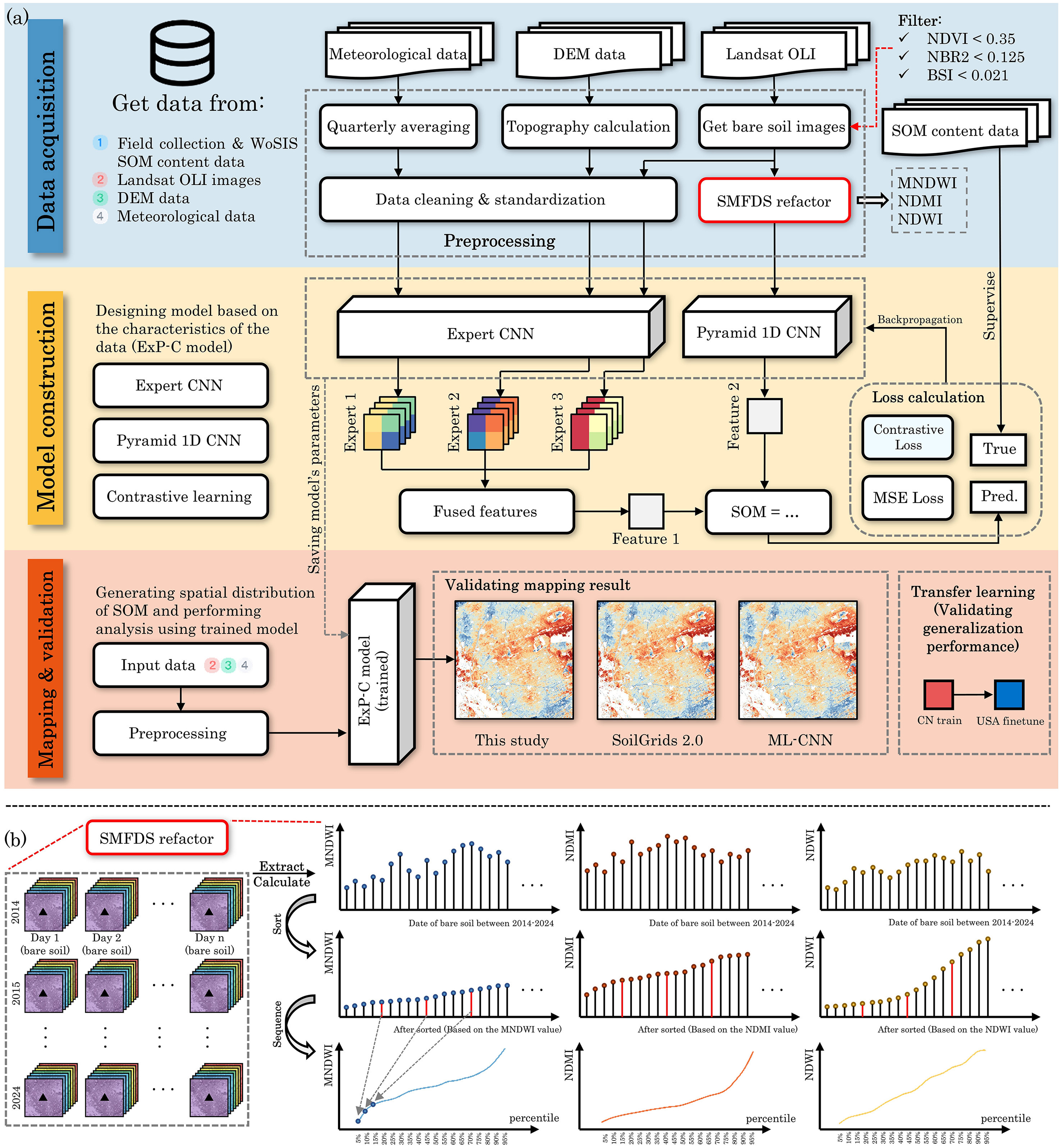 針對(duì)上述局限性,中國(guó)科學(xué)院東北地理與農(nóng)業(yè)生態(tài)研究所農(nóng)業(yè)遙感學(xué)科組以中美兩大典型黑土區(qū)(中國(guó)東北和美國(guó)密西西比河流域)的耕地為研究對(duì)象,創(chuàng)新性地提出了一種融合土壤水分動(dòng)態(tài)反饋序列(SMDFS)的新型時(shí)空深度學(xué)習(xí)框架(ExP-C)。研究團(tuán)隊(duì)收集了2014-2024年間的2616個(gè)表層(0-20厘米)土壤實(shí)測(cè)樣本,并深度融合了Landsat-8裸土合成影像、SRTM地形變量以及ERA5氣象等多源數(shù)據(jù)。研究通過(guò)對(duì)多時(shí)相水分相關(guān)光譜指數(shù)(MNDWI、NDWI、NDMI)進(jìn)行百分位重構(gòu)生成了SMDFS,從而精準(zhǔn)捕捉了不同SOM水平與土壤水分保持能力之間的動(dòng)態(tài)反饋特征。在此基礎(chǔ)上構(gòu)建的ExP-C模型,融合了用于提取靜態(tài)協(xié)變量空間上下文特征的“專(zhuān)家卷積網(wǎng)絡(luò)”,以及用于挖掘多尺度SMDFS時(shí)間序列模式的“金字塔1D卷積網(wǎng)絡(luò)”,并結(jié)合對(duì)比學(xué)習(xí)策略進(jìn)一步增強(qiáng)了模型的特征表示能力。