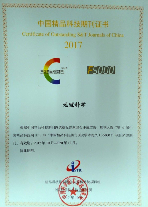 2017年10月31日,中國科學(xué)技術(shù)信息研究所在北京國際會(huì)議中心舉辦了“2017年中國科技論文統(tǒng)計(jì)結(jié)果發(fā)布會(huì)”。東北地理所主辦的期刊《地理科學(xué)》和《Chinese Geographical Science》分別入選“第4屆中國精品科技期刊”和“第4屆中國國際化精品科技期刊”,即“中國精品科技期刊頂尖學(xué)術(shù)論文(F5000)”項(xiàng)目來源期刊,有效期為2017年10月—2020年12月。