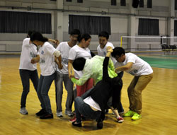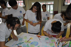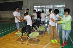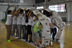 第一個項目是“大風吹”,目的是鍛煉同學們的反映能力,活動中落后的同學為大家表演了節目,為活動增添了很多樂趣。“輕柔體操”和“棒打薄情郎”項目,使得彼此不熟悉的同學相互熟悉了起來。之后的“信任之旅”項目中,同學們分別扮演“柺棍”和“盲人”,“盲人”需要在“柺棍”幫助和指引下通過層層障礙安全到達指定地點。這個項目結束后,同學們分享了自己的扮演“盲人”和“柺棍”的感受,金老師也為大家耐心講解了安全感的認定及因人而異的心理學問題。最讓大家開心的應屬“松鼠搬家”、“心有千千結”和“無敵風火輪”項目,這幾項活動同學們在團隊中相互配合,集思廣益,使得游戲妙趣橫生。隨后,金老師引導大家設計了“團體樹”做為此次活動的畢業作品。同學們積極開動腦筋,畫出了一棵象征著青春和夢想的大樹,并將自己對未來的期許做成標簽貼在了樹上。最后,全體師生和“團體樹”一起合影,在輕松快樂的氣氛中結束了本次活動。