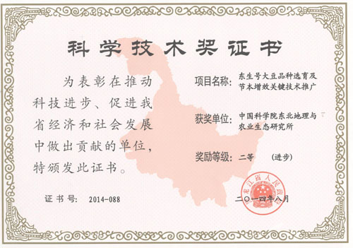 2014年8月8日,黑龍江省科學技術獎勵委員會公布了2014年黑龍江省科學技術獎勵決定,我所“東生號大豆品種選育及節本增效關鍵技術推廣”項目獲得科技進步二等獎。