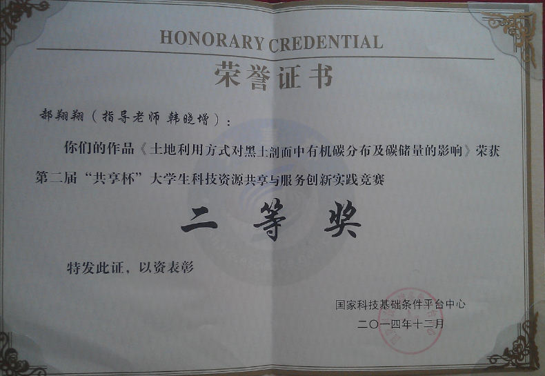 中國生態系統研究網絡是國家科技基礎條件平臺中心54個資源平臺之一,海倫農業生態實驗站做為中國生態系統研究網絡的成員,通過國家科技基礎條件平臺中心向全社會開放了水分、土壤、氣象和生物等長期生態監測數據。此次“共享杯”大學生競賽,郝翔翔以海倫站不同土地利用方式下的典型黑土為對象,研究了其剖面有機碳的分布及儲量,為黑土區固碳研究提供參考數據的同時,也通過“共享杯”大學生競賽宣傳了海倫站。