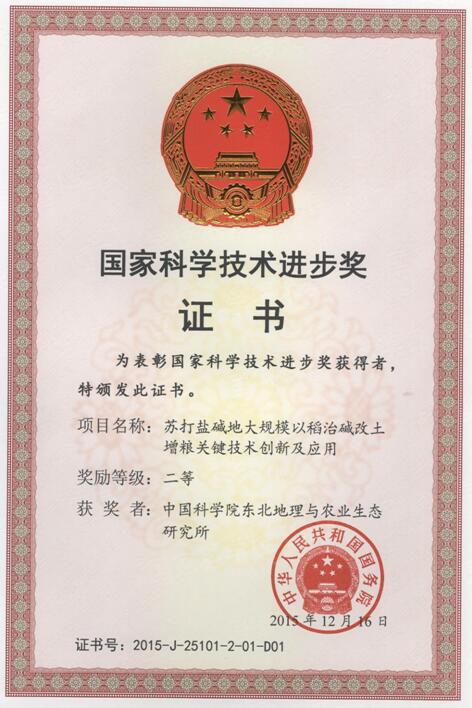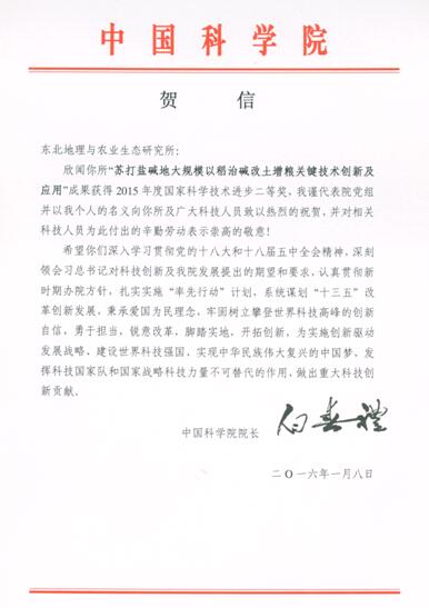 其中,由中國科學院東北地理與農(nóng)業(yè)生態(tài)研究所為第一完成單位,吉林省農(nóng)業(yè)科學院、吉林農(nóng)業(yè)大學、吉林省白城市農(nóng)業(yè)科學院以及通化市農(nóng)業(yè)科學研究院等5家單位共同參與完成的“蘇打鹽堿地大規(guī)模以稻治堿改土增糧關(guān)鍵技術(shù)創(chuàng)新及應(yīng)用”重大成果獲2015年度國家科技進步獎二等獎。項目第一完成人梁正偉研究員代表獲獎項目組出席了獎勵大會,受到了習近平主席、李克強總理等黨和國家領(lǐng)導(dǎo)人的親切接見并合影留念。1月8日中國科學院院長白春禮院士也向我所發(fā)來了賀電。