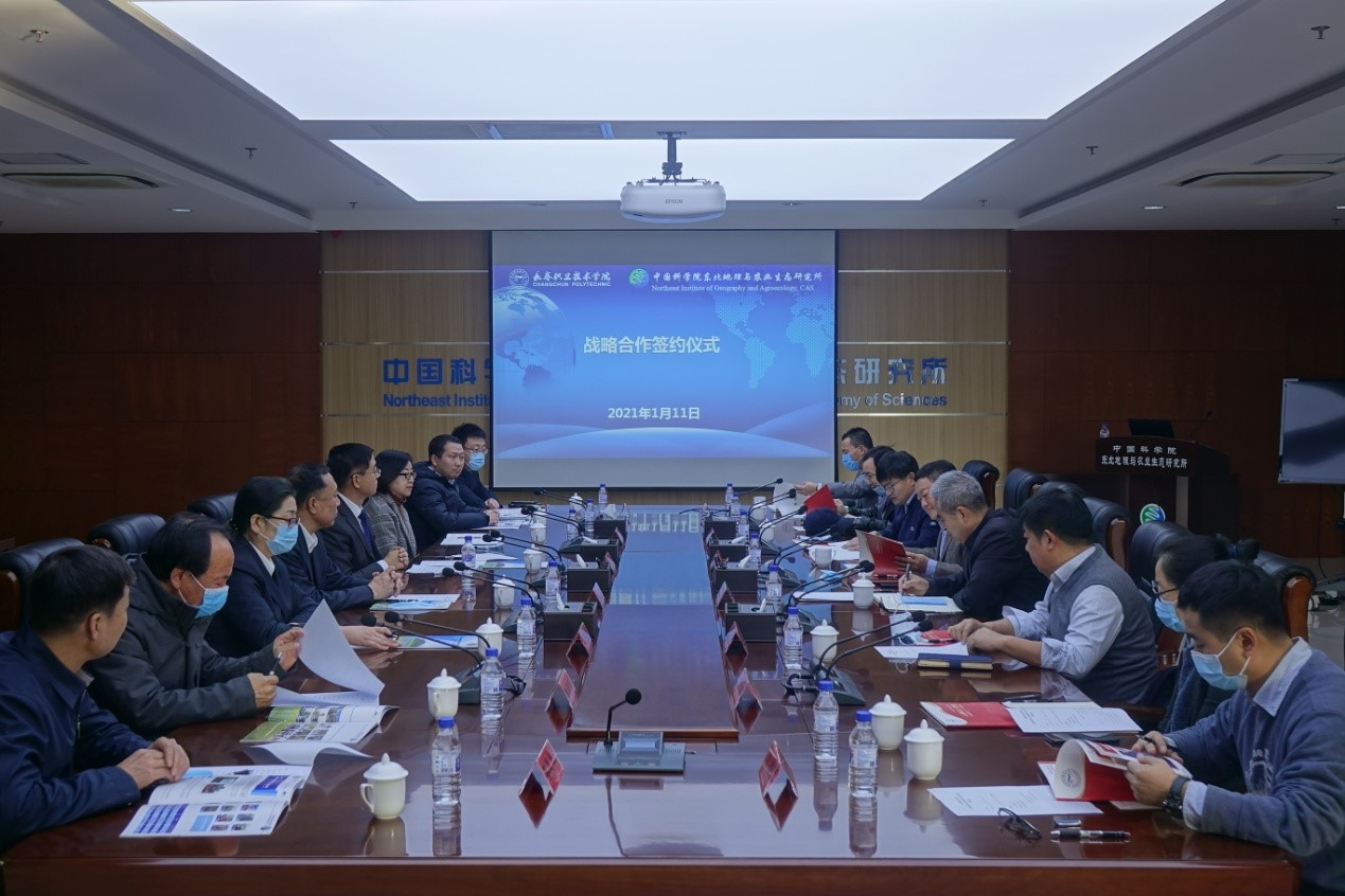 2021年1月11日,東北地理所與長(zhǎng)春職業(yè)技術(shù)學(xué)院戰(zhàn)略合作協(xié)議簽字儀式在東北地理所舉行。長(zhǎng)春職業(yè)技術(shù)學(xué)院校長(zhǎng)張湘富、副書(shū)記鄒德明、紀(jì)委書(shū)記黃蓓、副校長(zhǎng)王軍、副校長(zhǎng)朱國(guó)輝及相關(guān)人員一行三十余人參加了簽字儀式。東北地理所所長(zhǎng)姜明、副所長(zhǎng)李秀軍、副所長(zhǎng)武海濤、大豆重點(diǎn)實(shí)驗(yàn)室主任馮獻(xiàn)忠、黑土重點(diǎn)實(shí)驗(yàn)室主任田春杰、海倫實(shí)驗(yàn)站副站長(zhǎng)李祿軍、人事教育處處長(zhǎng)郭琳、科研計(jì)劃處副處長(zhǎng)崔明星等參加了簽字儀式。簽字儀式由武海濤主持。
