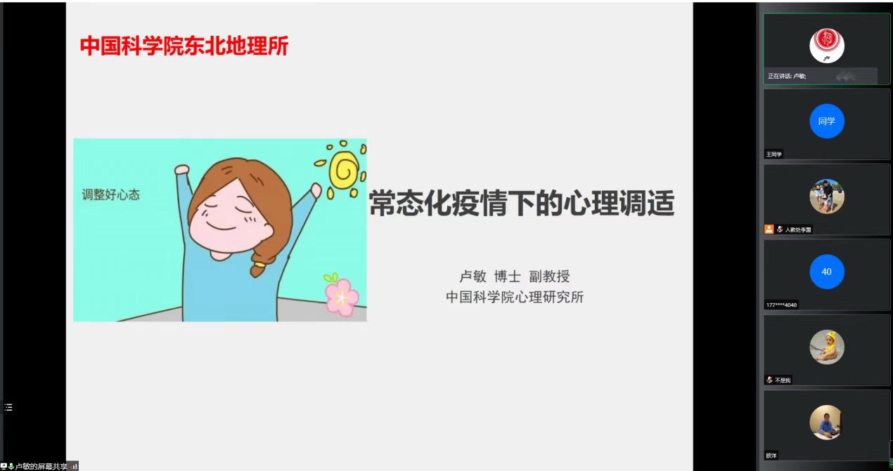 為更好地幫助東北地理所師生在疫情期間調(diào)適好心緒,為全面復(fù)工復(fù)產(chǎn)做好準(zhǔn)備,4月15日,東北地理所邀請(qǐng)中科院心理研究所國家公務(wù)員心理健康應(yīng)用研究中心副主任盧敏老師在線上進(jìn)行了主題為“常態(tài)化疫情下的心理調(diào)適”的心理健康專題講座。本次講座由人事教育處處長郭琳主持,研究生、導(dǎo)師共計(jì)100余人參會(huì)。