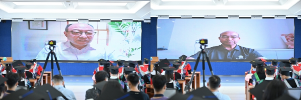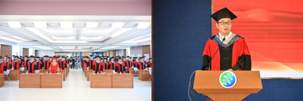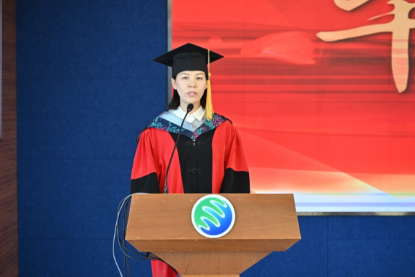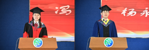 博士畢業(yè)生馮明銘、碩士畢業(yè)生楊永傳代表全體博士和碩士畢業(yè)生致畢業(yè)感言。兩位畢業(yè)生代表回顧學(xué)習(xí)生涯、分享科研感悟,感念師恩,并表達(dá)了對(duì)母校的不舍之情。經(jīng)過(guò)這段求學(xué)生涯的錘煉,他們?cè)诖鞌≈谐砷L(zhǎng),在堅(jiān)持中奮發(fā),他們自立自強(qiáng),奔赴夢(mèng)想。